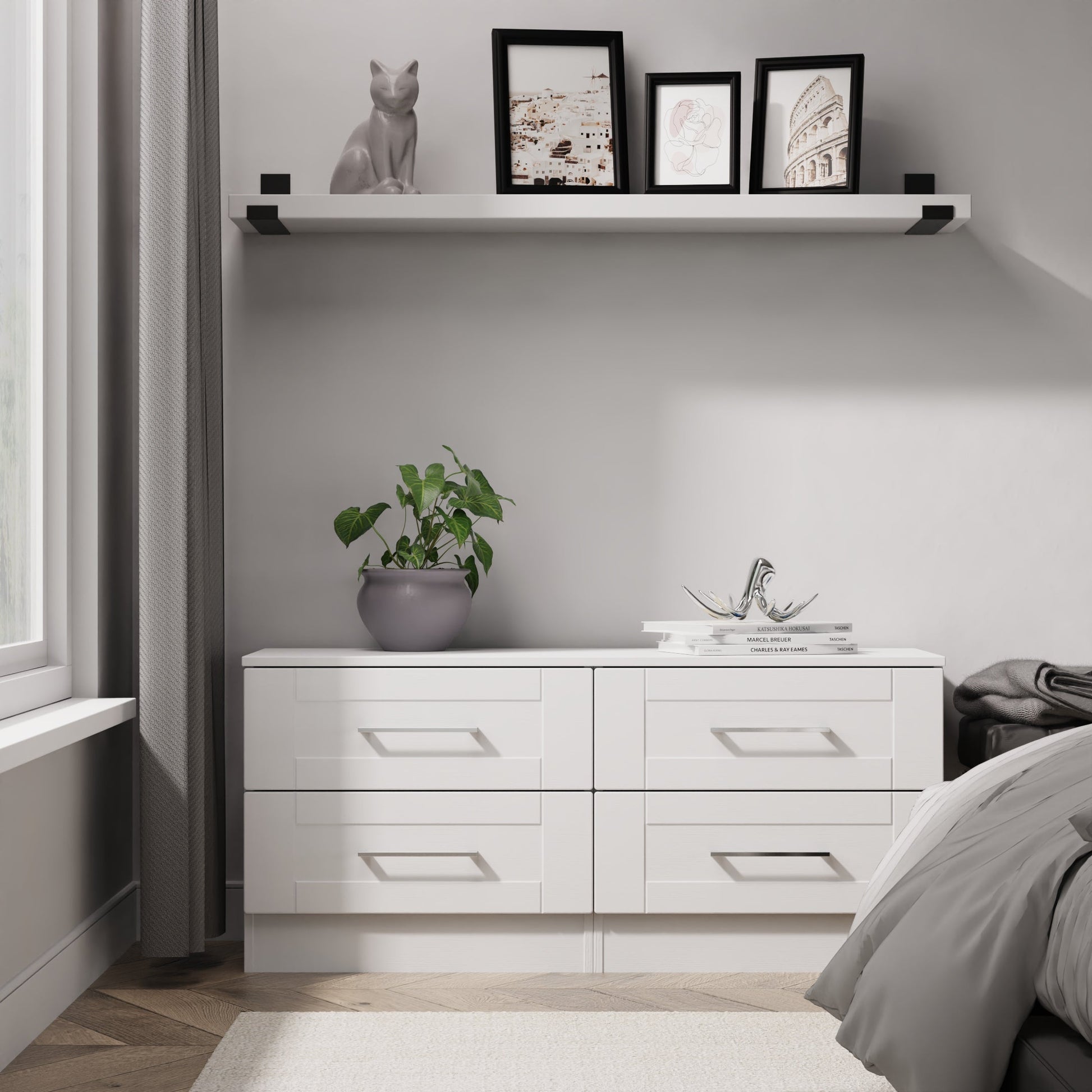 A large 4 drawer bed box. A Perfect storage solution for any room (not just the end of your bed). Could also be used as a low level TV/Media stand. Wood grain effect, panelled design, recessed fronts and chrome handles, this Range is a beautifully elegant collection. With this range you have the freedom to choose from a wide range of furniture configurations, allowing you to create the perfect combination to optimise your storage space. All our furniture is made to order in the United Kingdom, to the highest quality. It is delivered within 10 working days direct to your location of choice by one of our two man delivery teams, and comes fully assembled (although legs may be removed to prevent damage in transit). Part of the York Collection.