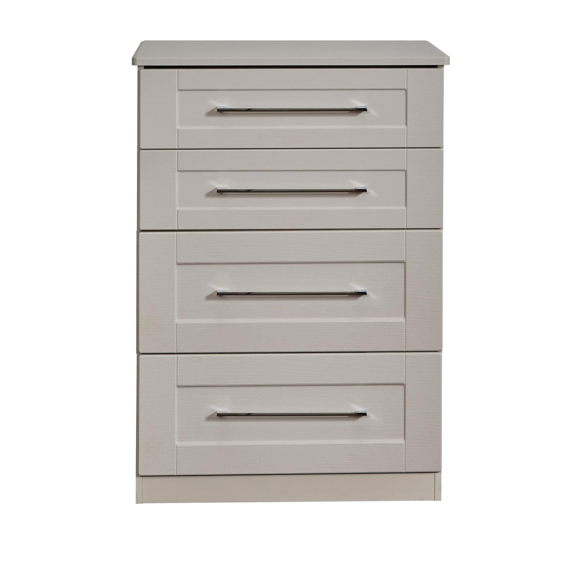 This deep 4 drawer chest of drawers is practical and stylish. Perfect for any home as a free standing storage unit. Wood grain effect, panelled design, recessed fronts and chrome handles, this Range is a beautifully elegant collection. With this range you have the freedom to choose from a wide range of furniture configurations, allowing you to create the perfect combination to optimise your storage space. All our furniture is made to order in the United Kingdom, to the highest quality. It is delivered within 10 working days direct to your location of choice by one of our two man delivery teams, and comes fully assembled (although legs may be removed to prevent damage in transit). Part of the York Collection.