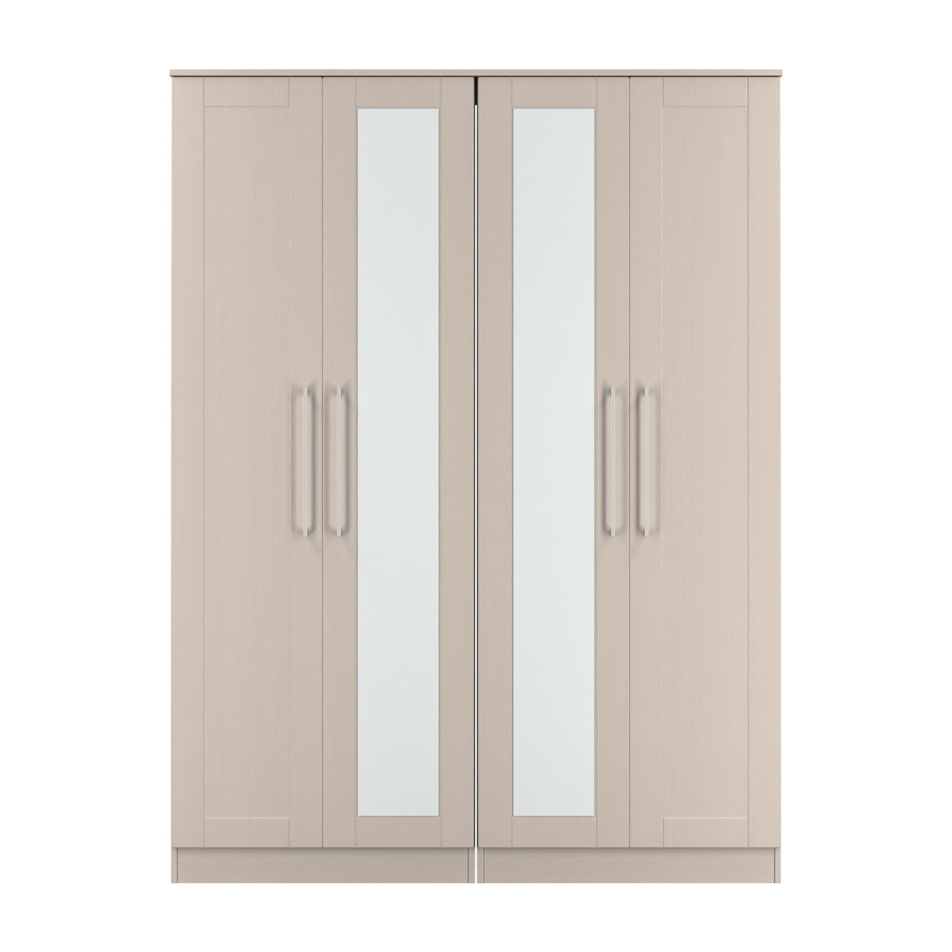 This tall 4 door wardrobe provides an increased storage solution for your clothes. Also features 2 full height central mirrored doors. Wood grain effect, panelled design, recessed fronts and chrome handles, this Range is a beautifully elegant collection. With this range you have the freedom to choose from a wide range of furniture configurations, allowing you to create the perfect combination to optimise your storage space. All our furniture is made to order in the United Kingdom, to the highest quality. It is delivered within 10 working days direct to your location of choice by one of our two man delivery teams, and comes fully assembled (although legs may be removed to prevent damage in transit). Part of the York Collection.