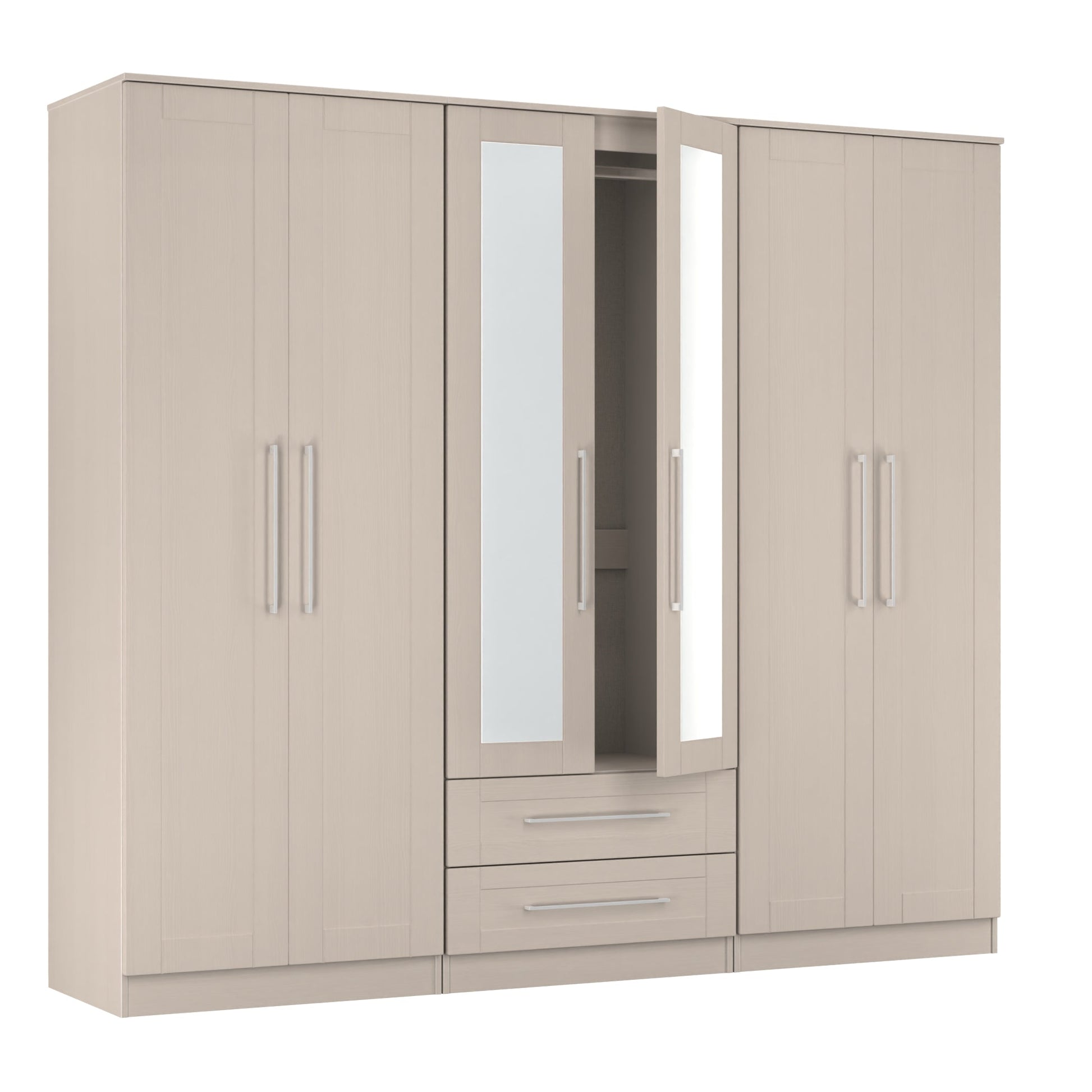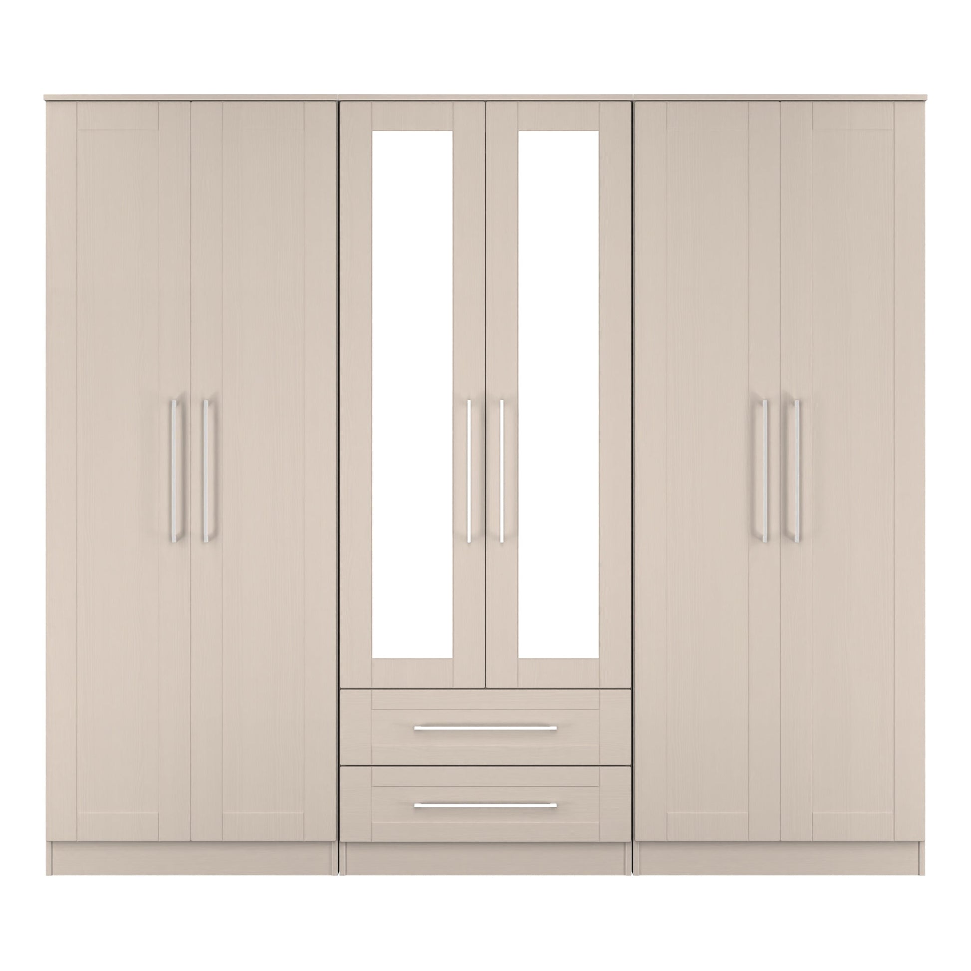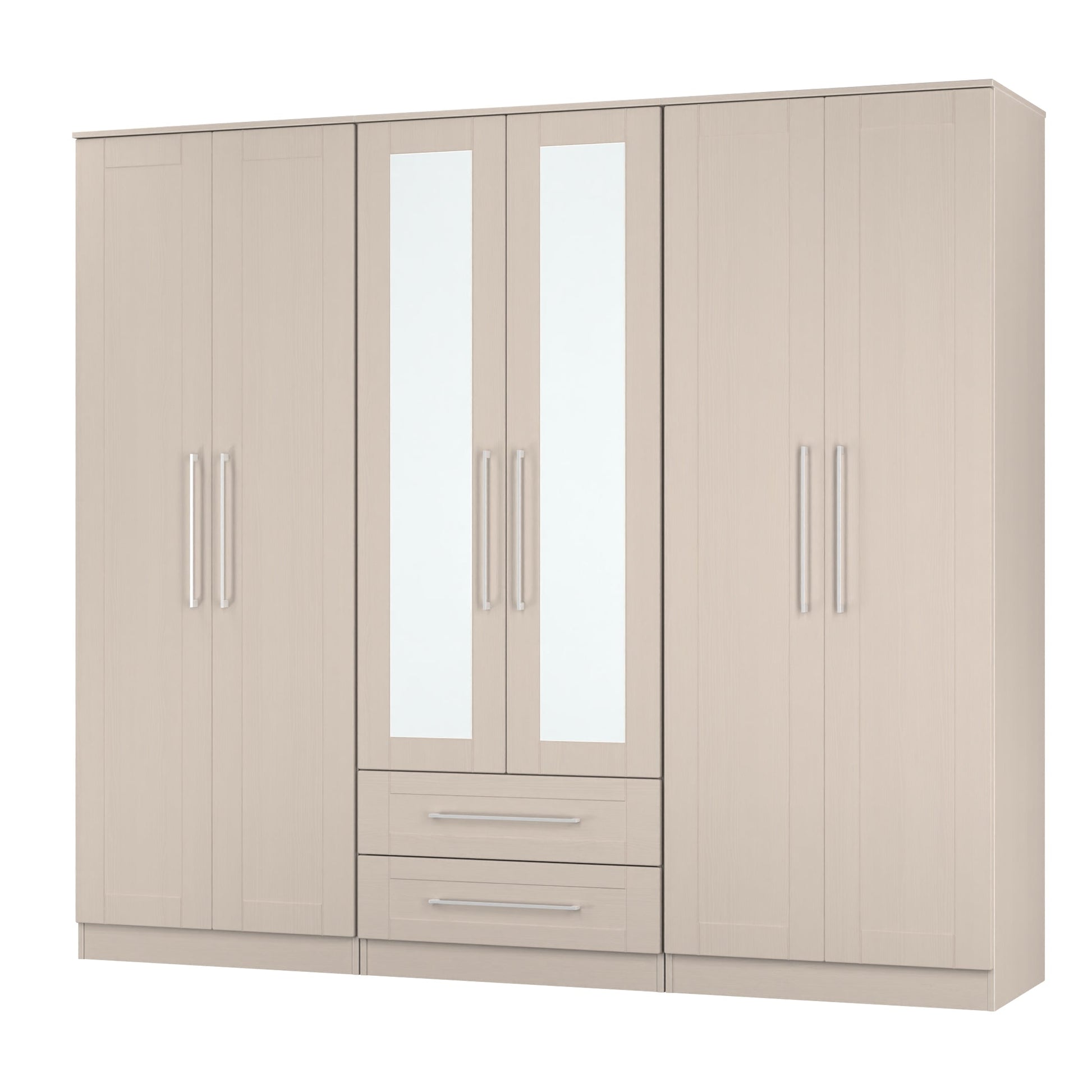 York Tall Mirror Wardrobe Cream 6 Doors 2 Shelves 2 Drawers 222cm